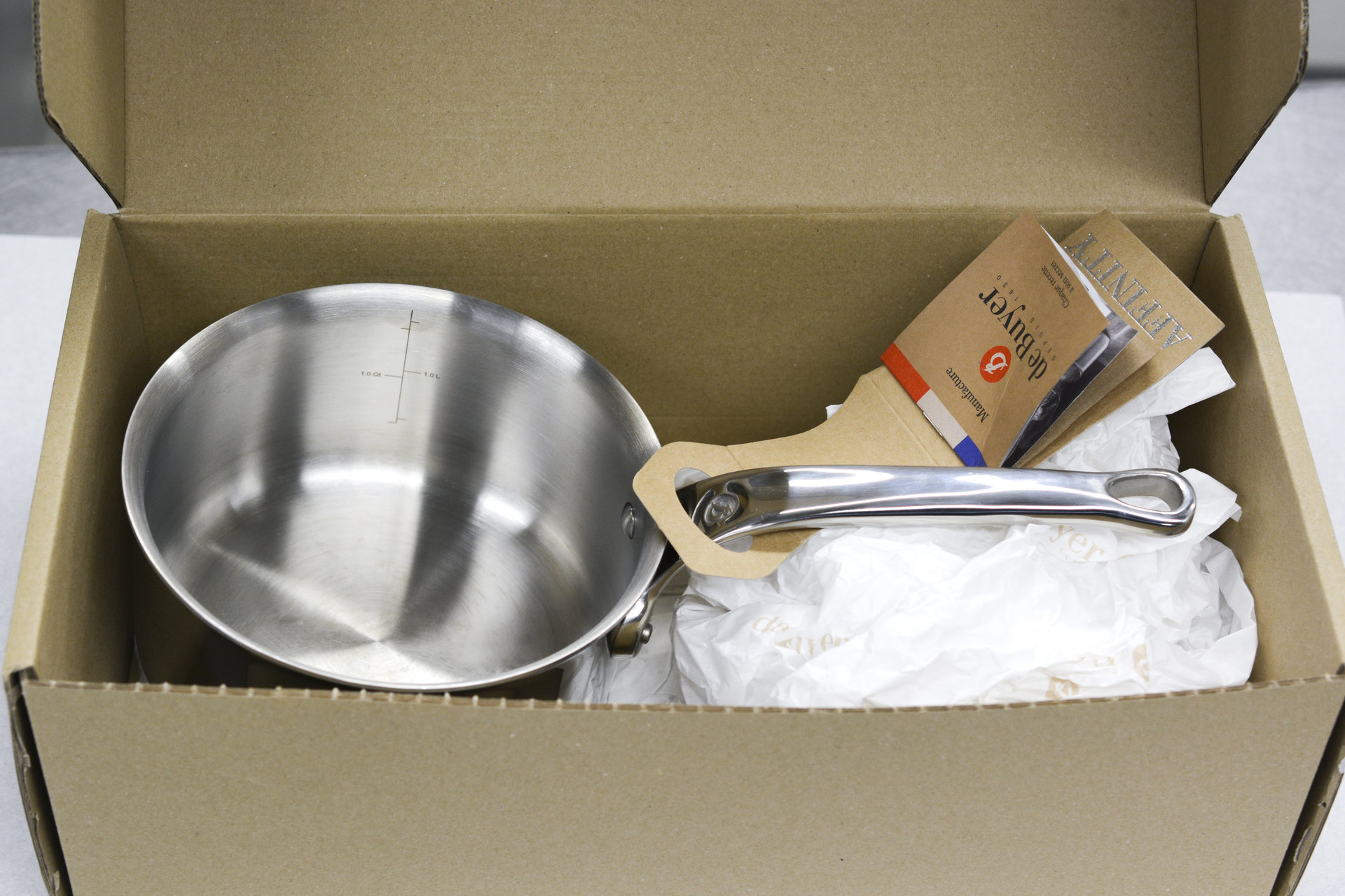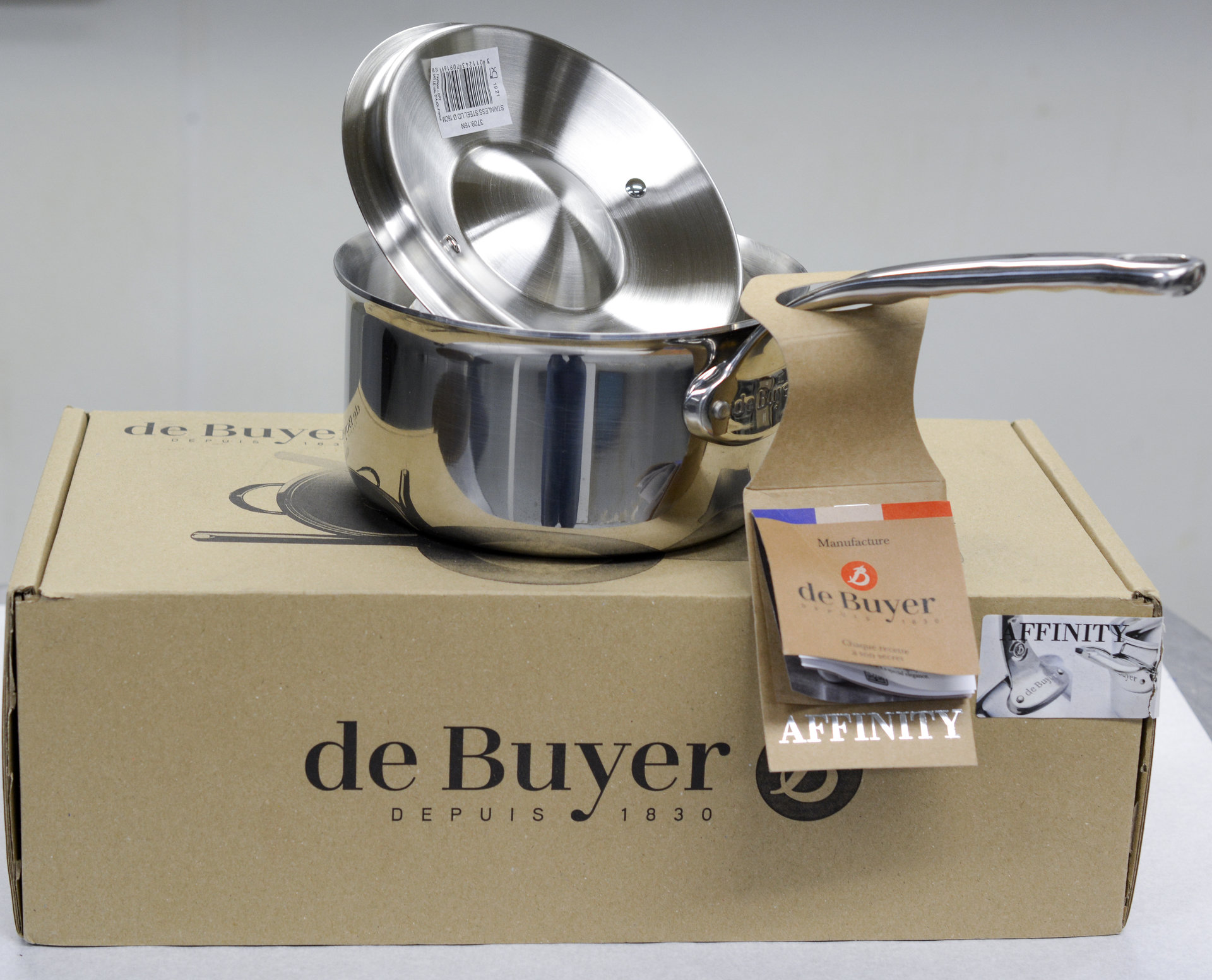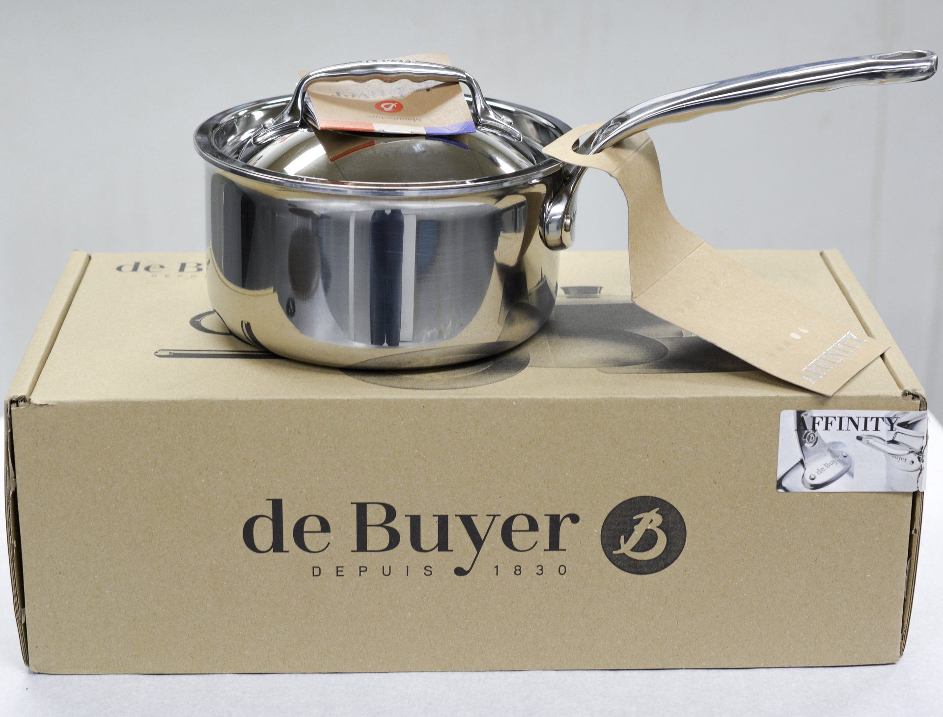 Upgrade your kitchen while also adding a touch of elegance with this de Buyer Affinity 1.9 qt. 5-ply stainless steel sauce pan with cover! Incredibly versatile, this pan and included lid work together with any type of cooking surface and are absolutely perfect for boiling and reducing sauces or caramelizing foods. Its tall walls and drip-free pouring rim allow for extremely efficient and hassle-free cooking.