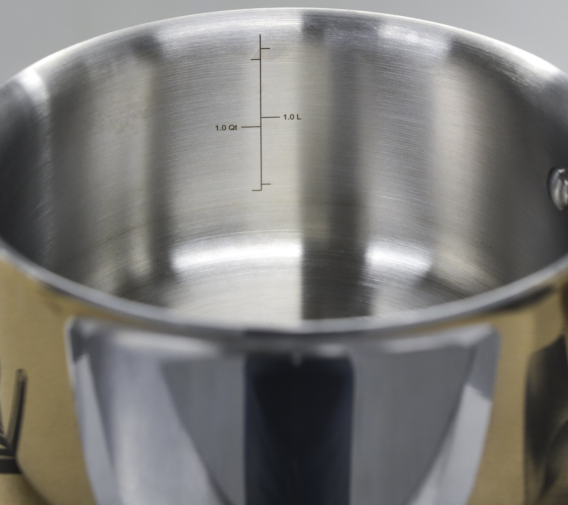 • Capacity: 1.8 qt.Bottom of the pan indicates 1.6 qt (1.5 Liter) but actual capacity is 1.8 qt as reflected inside the vessel