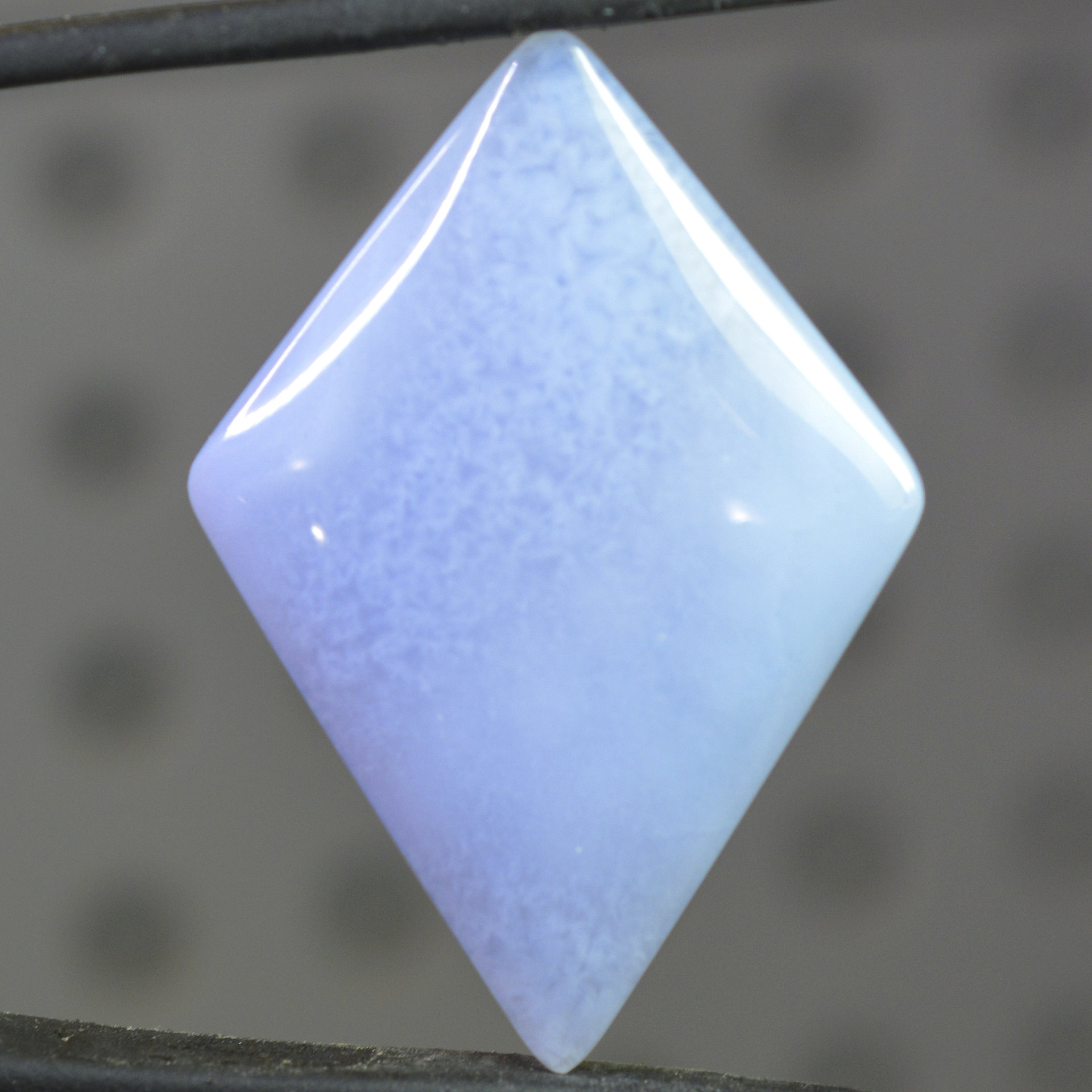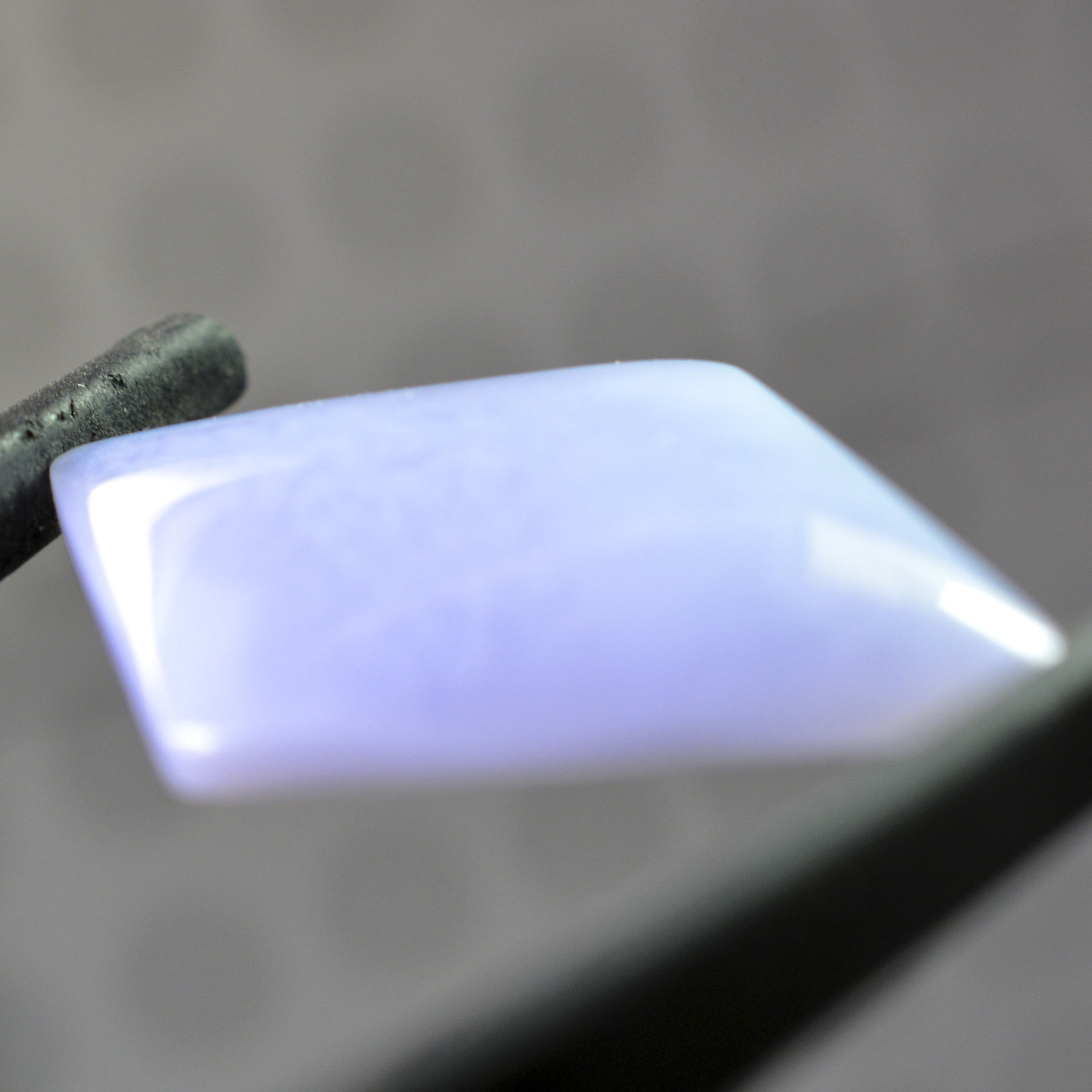 Here for your consideration is an exceptionally beautiful hand crafted Malawi Blue Chalcedony cabochon. This incredible old stock copper included cryptocrystalline form of silica is coveted for it's rich vibrant near adularescent translucency. According to the IGS, Chalcedony such as this Malawi blue, was once thought to be a 'fibrous' variety of cryptocrystalline quartz, but more recently discovered to be a combination of quartz and another silicate mineral; Moganite (a polymorph of quartz). Both quartz and moganite share the same silicon dioxide chemical composition, but they have varying crystal structures. Moganite is monoclinic, while traditional quartz belongs to the trigonal crystal system. Chalcedony forms with a hexagonal crystal structure. With some very minor iron inclusions, this piece exhibits a brilliant semi translucent, slight adularescent- iridescent blue lavender powder blue.