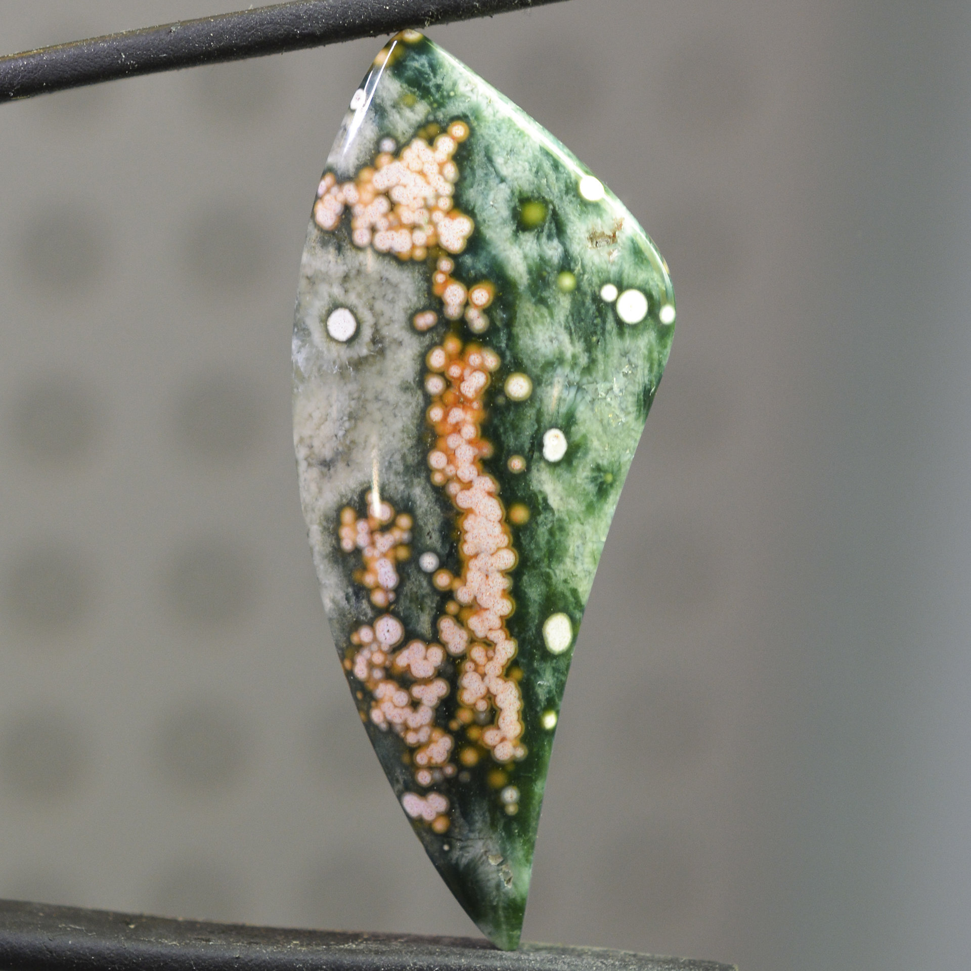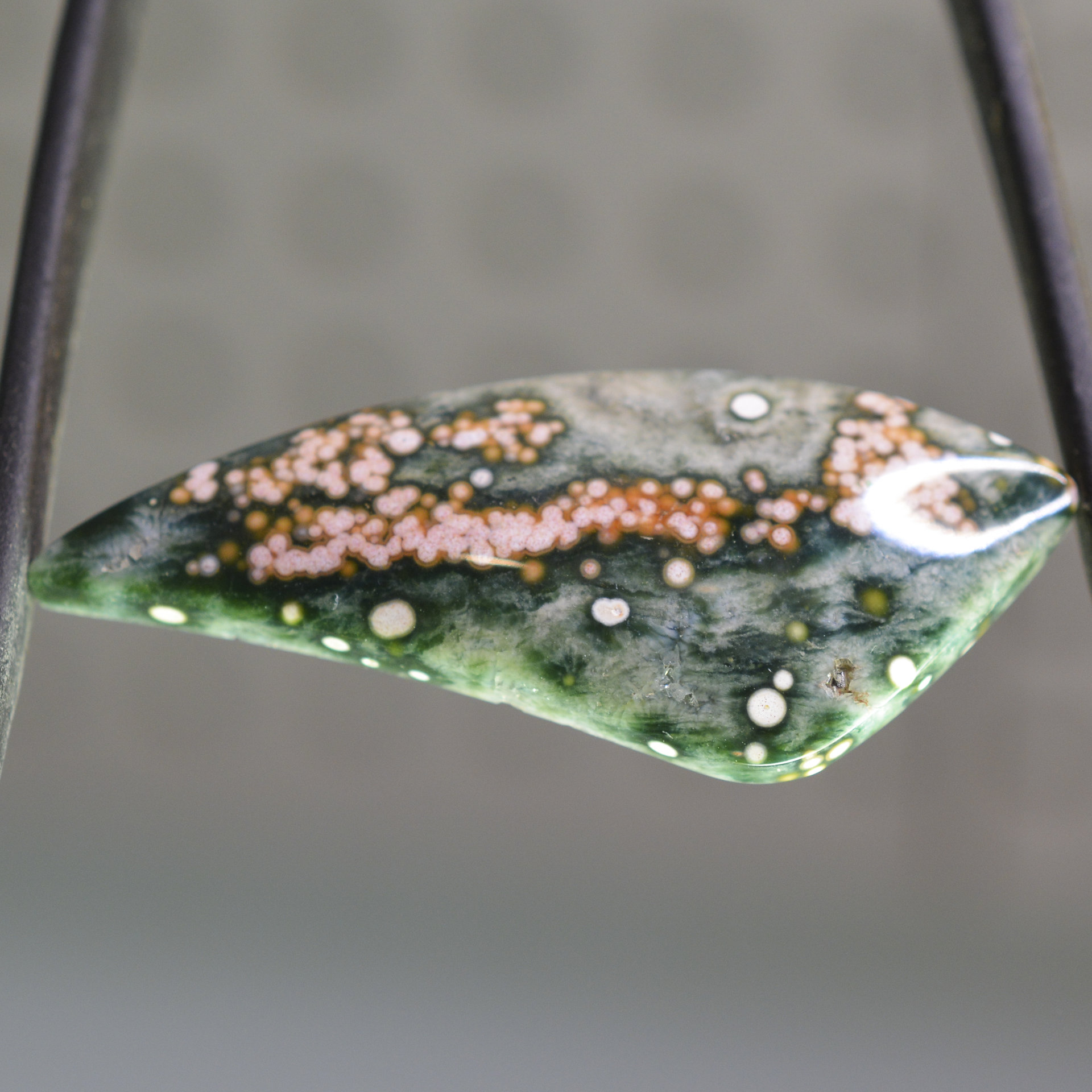 Here for your consideration is an outstanding, vintage multi rung Indian Ocean Jasper Cabochon. This scarce old stock material exhibits wonderful flowing aqua like deep greens, pinks, crystalline pockets and peachy orange orbs with random pattern.